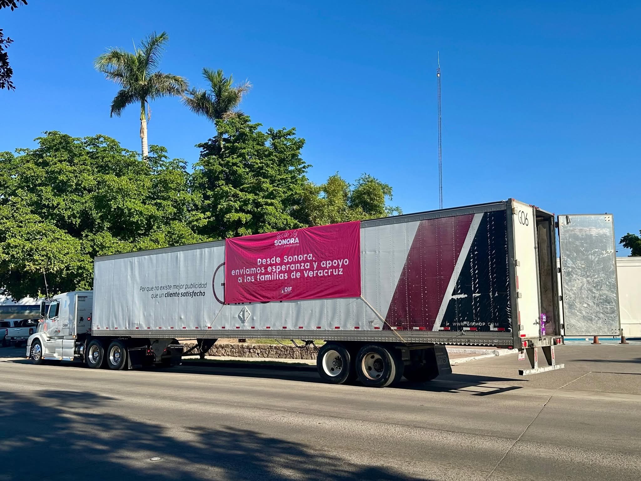 Un tráiler cargado con víveres, artículos de higiene, productos de desinfección y agua potable partió de Sonora con rumbo a Veracruz.