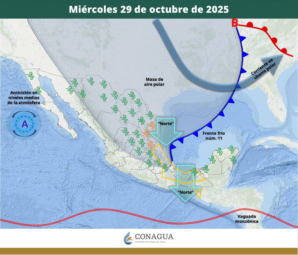 El frente frío número 11 y su masa de aire polar avanzan sobre el norte del país, provocando descenso de temperatura y fuertes vientos en distintas regiones de Sonora, especialmente en el norte y noreste del estado. En contraste, una circulación anticiclónica mantiene cielos despejados y sin probabilidad de lluvia.