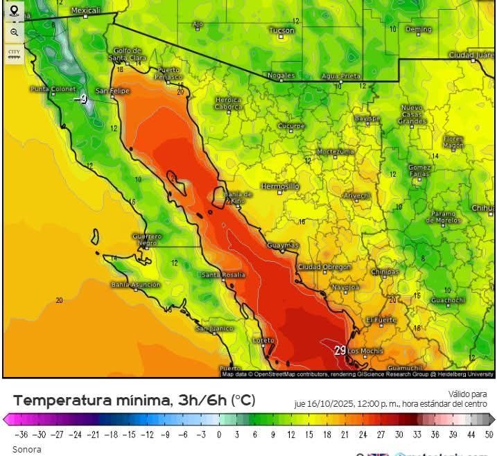 Durante los días 15 y 16 de octubre, un nuevo frente frío se aproximará al noroeste de Sonora, provocando un notable descenso de temperaturas y fuertes rachas de viento en gran parte del estado. En la zona montañosa, las temperaturas podrían caer por debajo de los 8°C durante la madrugada y noche.