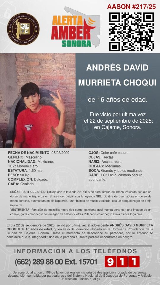 La Fiscalía de Sonora emitió una Alerta Amber para la búsqueda y localización de Andrés David Murrieta Choqui, de 16 años de edad, quien fue visto por última vez el 22 de septiembre de 2025 en el municipio de Cajeme, Sonora.